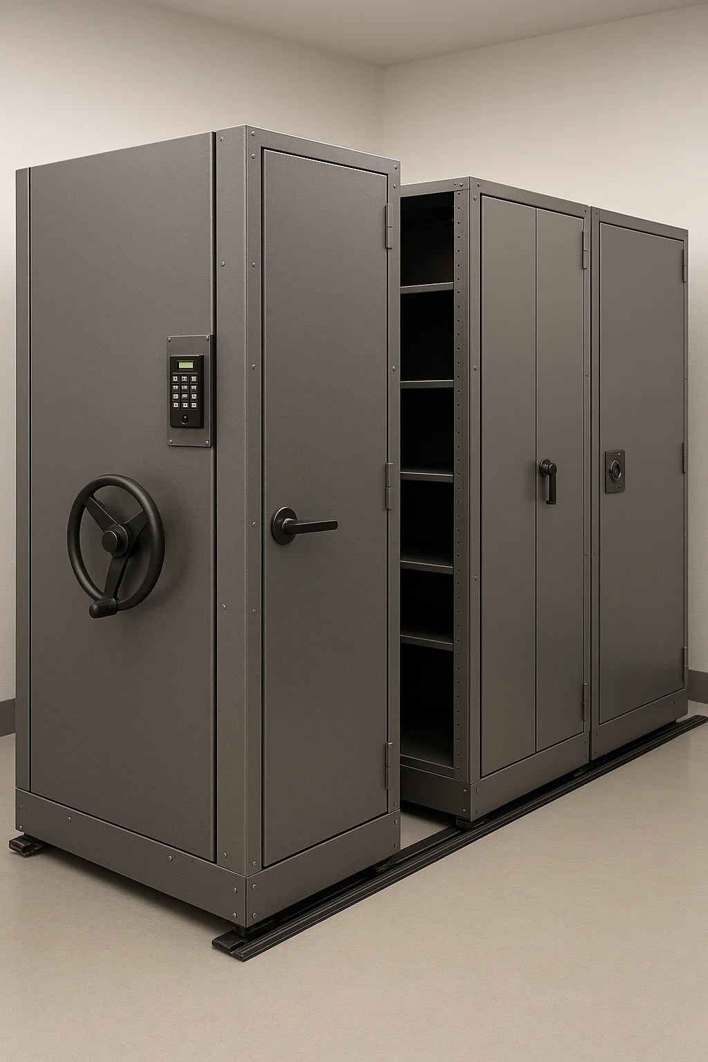 Space Optimization: Utilizes compact mobile shelving on tracks, eliminating fixed aisles. Cabinets slide laterally to create temporary access aisles only where needed, maximizing storage density per square foot.